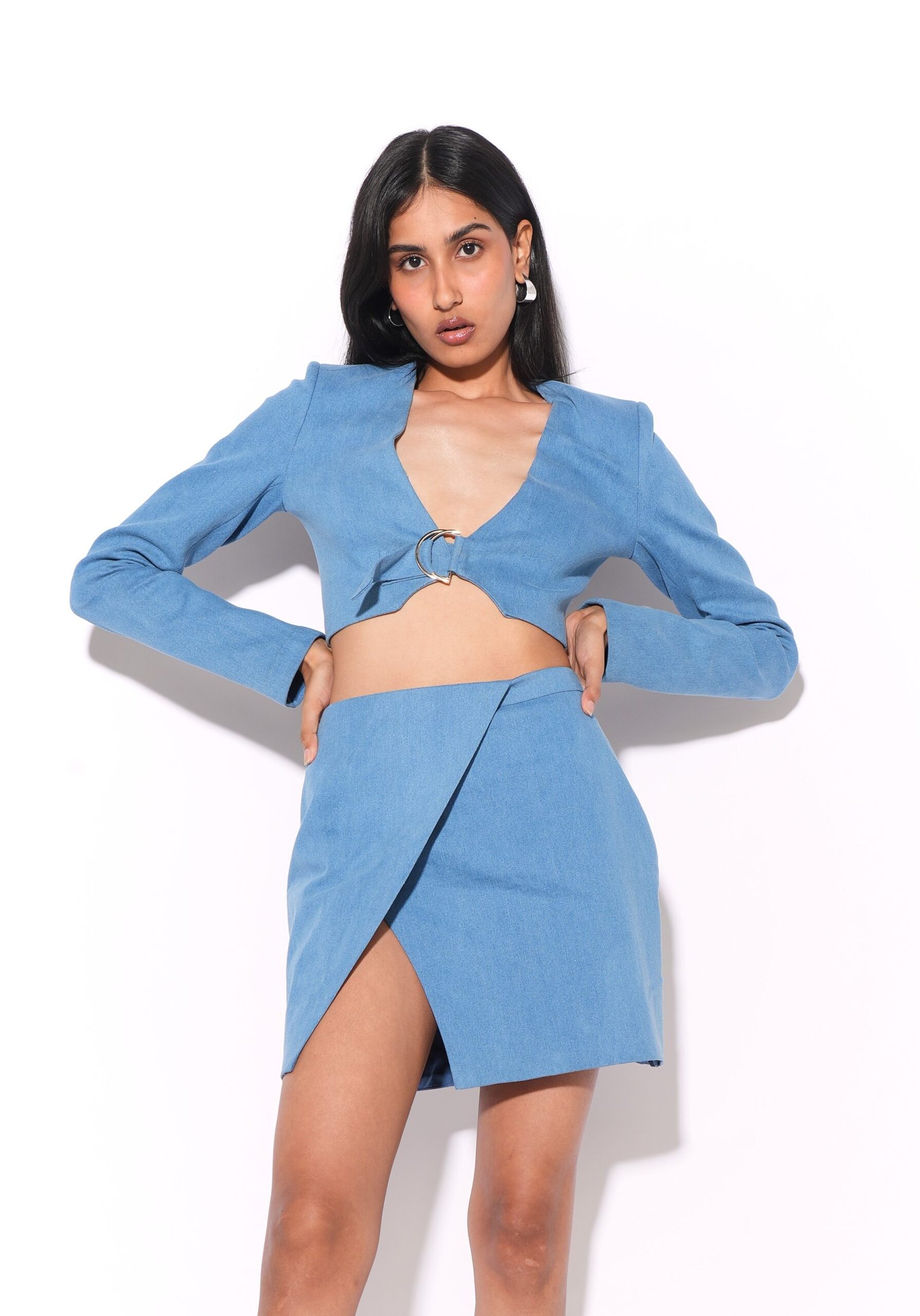 Elevate your wardrobe with the Sky Set, a stunning two-piece outfit that blends contemporary chic with bold femininity. The cropped blazer-style top features a plunging neckline with a stylish front-ring closure that adds a daring touch. Long sleeves provide balance to the sultry silhouette, while the matching high-waisted wrap mini skirt completes the look with elegance and edge.